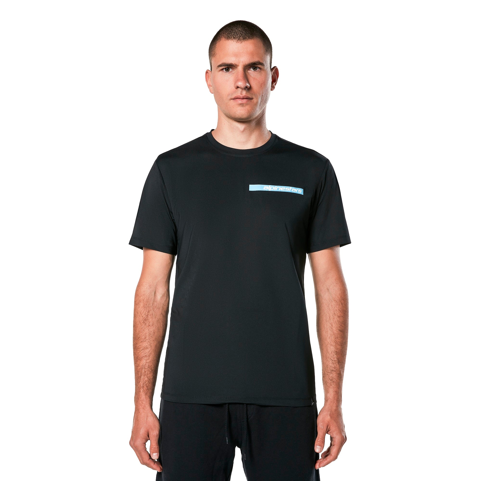 Camiseta Alpinestars de manga curta com absorção de suor e tecido de desempenho perfurado por toda a peça. Gola redonda com costura elástica. Estampa de barra de logotipo linear no peito, além do icônico logo Alpinestars na manga.